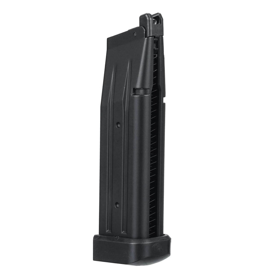 The ergonomic textured grip provides better handling in high-impact situations, with an ambidextrous magazine release making it comfortable for left or right hand users. Super Enhanced Formulated Polymer (SEFP) feed lips and base plates provide better resilience, making this an ideal sidearm for competitive gameplay.