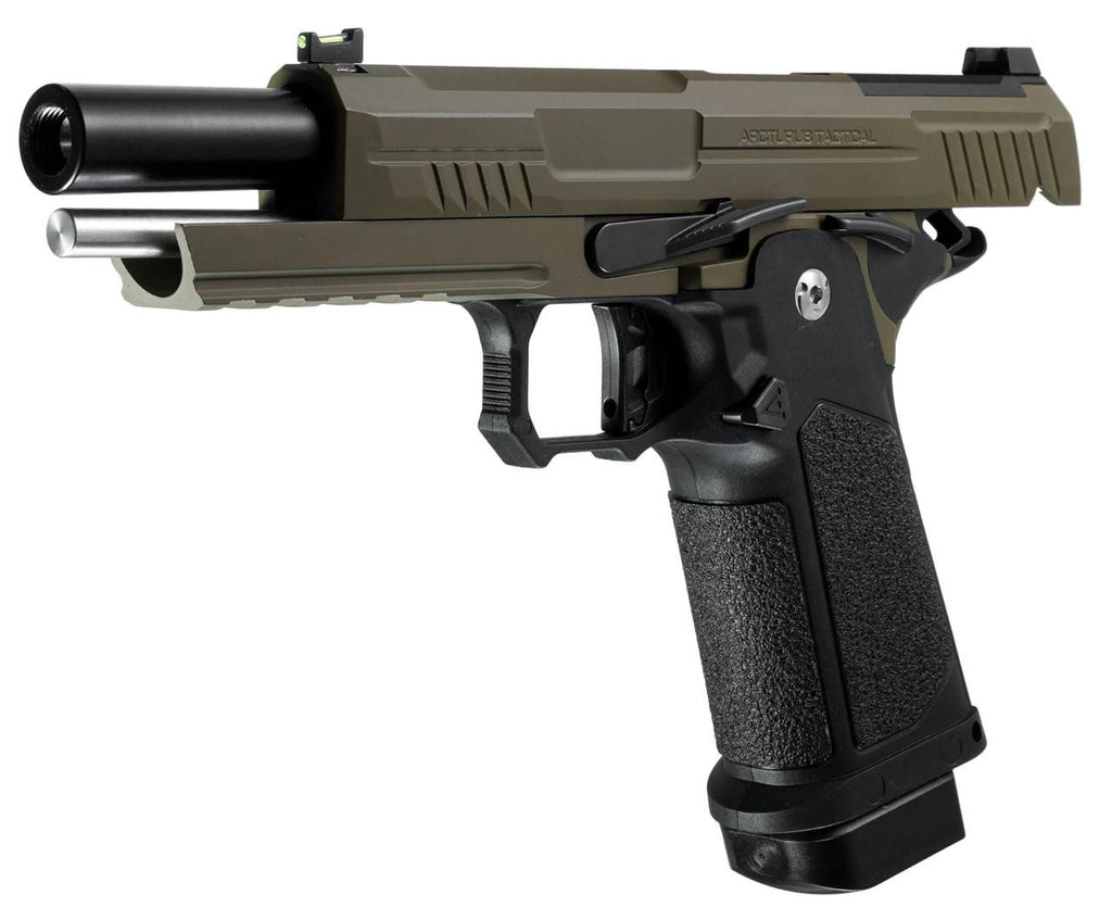 Built for durability, the Vanguard boasts Super Enhanced Formulated Polymer (SEFP) base plates and feed lips for improved resistance to impact. At around 950g, it provides a realistic feel without compromising maneuverability. Featuring a muzzle energy of up to 1.0 joule, this gas blowback semi-automatic airsoft pistol is precision-tuned for control and consistency out of the box. The ARCTURUS Vanguard 5" Hi-Capa GBB Airsoft Pistol in Black/Tan is ready for use, making it ideal for those who require a customizable platform and high-level performance.