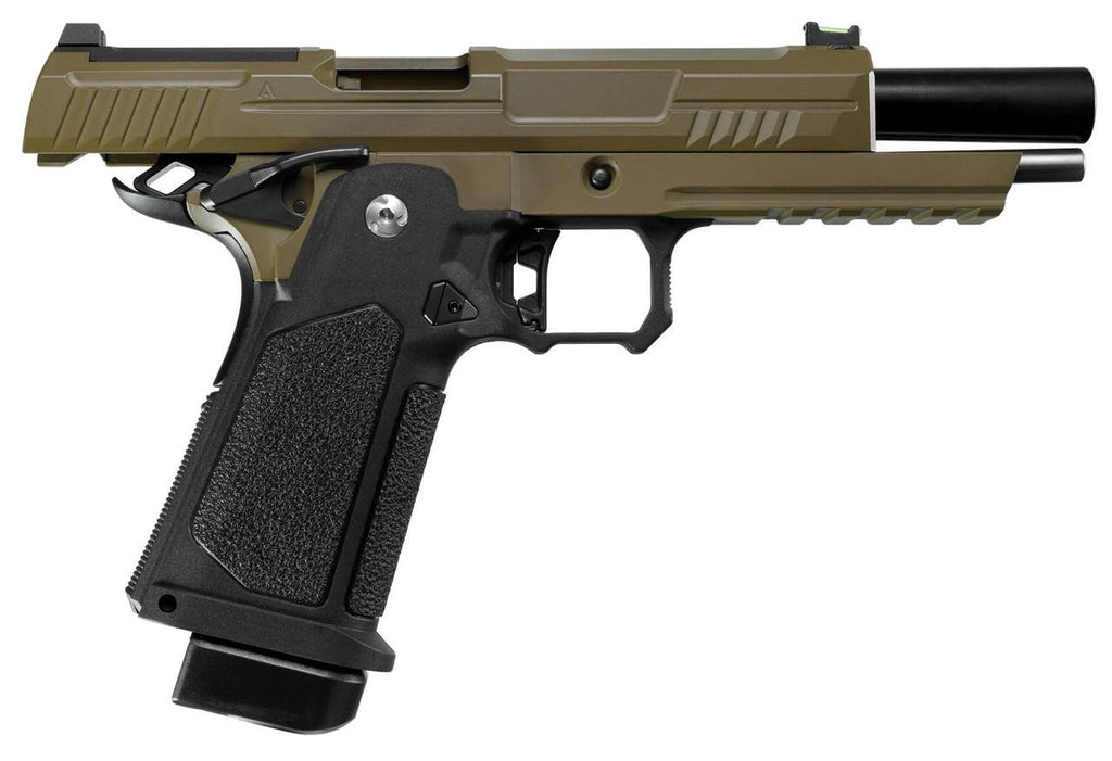 Constructed from high-grade MIM steel and reinforced nylon fiber, this airsoft pistol, finished in tactical Black/Tan, offers an excellent balance of durability, strength, and light handling. The optics-ready slide accommodates quick, easy mounting of red dot sights, directly improving competitive shooting speed and accuracy. Precision-crafted internal parts and streamlined air efficiency guarantee reliable high-performance function. The ambidextrous magazine release accommodates all shooters.