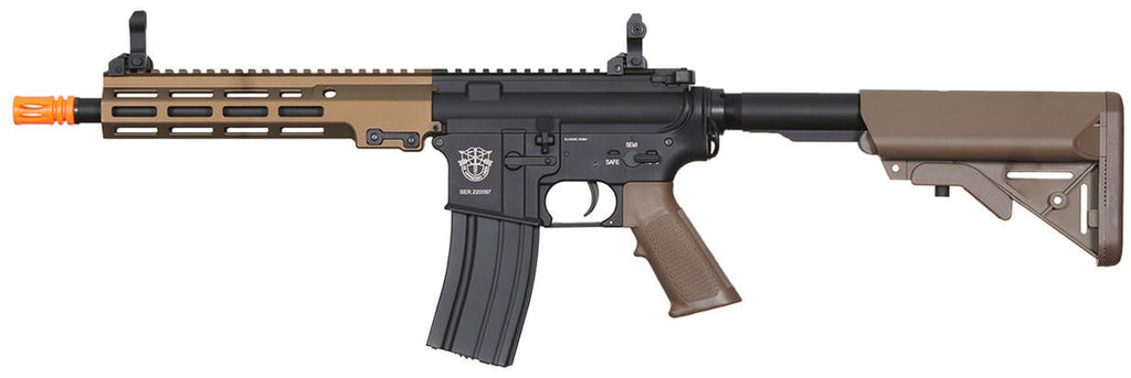 The Classic Army 9.5" MK16 ECS Airsoft AEG Rifle in two-tone is a top-of-the-line airsoft rifle designed to deliver peak performance and reliability on the field. As a leading brand in the airsoft industry, Classic Army has built a reputation for producing high-quality airsoft guns, and the MK16 ECS is no exception. Constructed with durability in mind, this AEG rifle features nylon polymer upper and lower receivers, as well as a stock and motor grip, ensuring a strong and lightweight build. The full metal Version 2 gearbox enhances the rifle's overall performance and allows for easy upgrades and modifications.