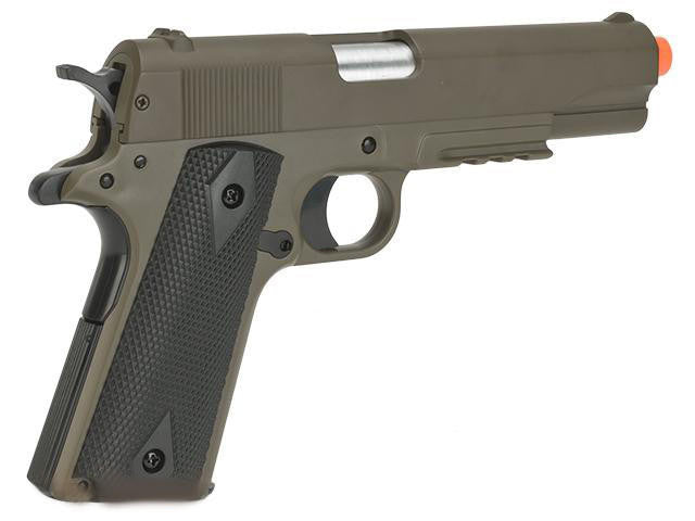Looking for a classic airsoft pistol that won't break the bank? Look no further than the Colt M1911A1 Airsoft Spring Pistol with Metal Slide, Tan from SoftAir. With its authentic look and feel, this pistol is perfect for backyard plinking or as a prop for your next film project. The M1911A1 features a durable metal slide that gives it a realistic weight and feel in the hand. It also has a 12-round magazine and fires in single shot mode, so you can hone your marksmanship skills without having to worry about running out of ammo too quickly. The pistol measures 225mm x 150mm, making it the perfect size for a sidearm or backup weapon during airsoft battles. Its spring-powered system is easy to use, making it a great option for beginners and veterans alike. The M1911A1 also features a non-adjustable hopup, which helps to improve accuracy and distance by imparting spin on the BB as it exits the barrel. The pistol has a firing velocity of 325 FPS, making it a great choice for outdoor target shooting. Included with the pistol are a 12-round magazine and a user manual. So if you're looking for a classic airsoft pistol that won't break the bank, be sure to check out the Colt M1911A1 Airsoft Spring Pistol with Metal Slide, Tan.