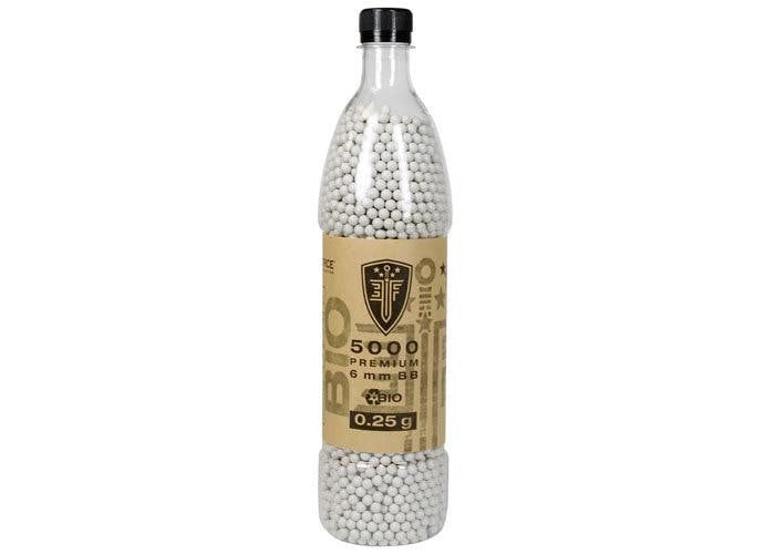Ensure your never left out on the battlefield without ammo, and pick yourself up an extra 5,000 rounds of 0.25g premium grade biodegradable BBs from Elite Force! These eco-friendly BBs decompose naturally over time and eliminate the need for clean up after games. These BBs can easily withstand the impact and abuse from gas powered rifles and high powered AEGs with metal gearboxes. These BBs come in a convenient plastic carrying bottle with resealable cap, to make transportation a breeze while eliminating the risk of a torn or spilled bag. Get back on the battlefield confident you have enough ammo for whatever may come your way!