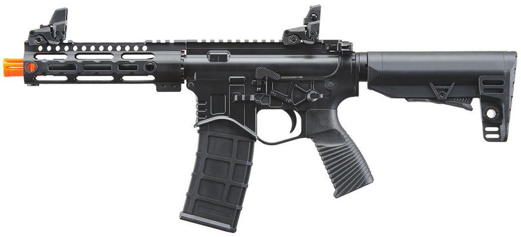The Golden Eagle Compact BD Style 7" M-LOK M4 GBB Airsoft Rifle in black is a reliable and high-performance gun for airsoft enthusiasts. With its full metal CNC machined M-LOK handguard and receiver, this airsoft rifle is built to last. The high-density polymer stock and pistol grip provide durability and comfort during gameplay. Designed with a full-length rail and removable front and rear flip-up sights with built-in fiber optics, this airsoft rifle is perfect for long-range targeting. The lightweight textured pistol grip increases handling and weapons manipulation for improved accuracy. The six-position stock can be easily adjusted using the slim and responsive lever and includes ambidextrous QD ports to fit your preference. The realistic blowback action provides an immersive firing experience, while the adjustable hop-up allows for maximum range and precision. This airsoft rifle operates using green gas and can shoot up to 300-310 FPS with .20g BBs. The 35 round magazine capacity allows for extended gameplay without the need for frequent reloading. Compatible with the WA/GHK GBB system, this airsoft rifle includes a muzzle brake, cleaning rod, and a manual. Get ready to dominate the battlefield with the Golden Eagle Compact BD Style 7" M-LOK M4 GBB Airsoft Rifle.