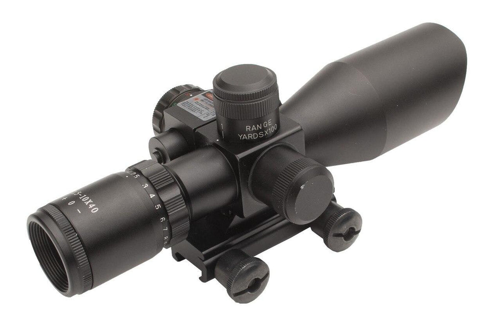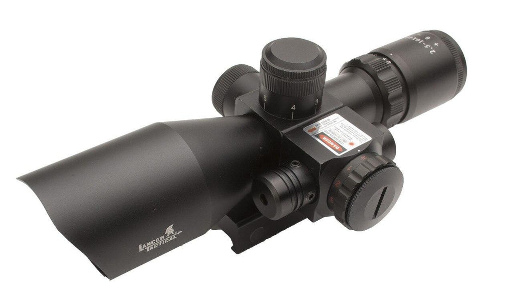 Lancer Tactical's model CA-414B scope bridges the gap between having the features you want in a high-end scope without costing a fortune. The variable zoom from 2.5 to 10X power means you aren't locked into a fixed magnification that often is too much for closer engagements, leading to tunnel vision and missed opportunities. The ability to adjust the scope on the fly means that you can get the extra magnification when you need it; an especially nice feature when trying to hit long-distance targets or playing in the woods where it can be difficult to differentiate between friends or foes. The Mil Dot reticle makes for easy windage and elevation adjustments to make every shot count. The reticle can also be illuminated with a twist of the variable brightness rheostat dial on the side of the scope letting you choose between green and red crosshairs. The integrated red laser pointer on the side of the scope can be zeroed in to your crosshairs increasing your accuracy and even helping you shoot more accurately even when your not aiming down the scope!