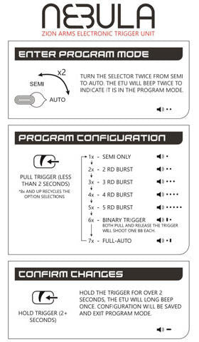 - Features a Zion Arms fully programmable electronic trigger unit for custom burst modes
