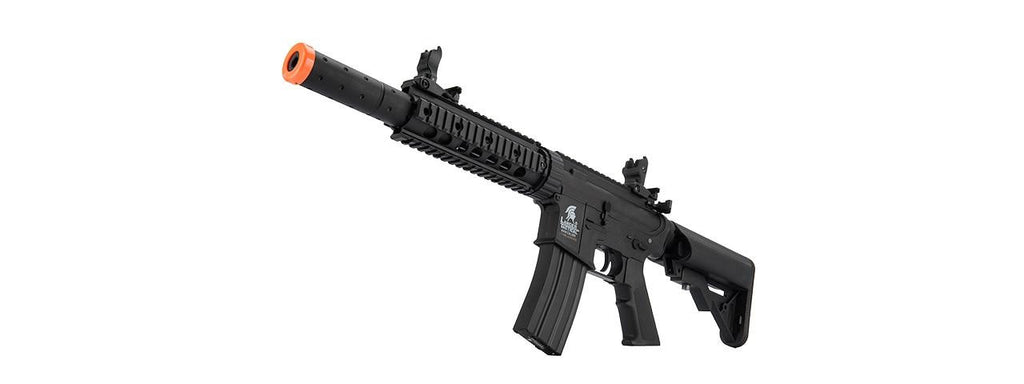 The M4 SD is the latest offering from Lancer Tacticals’ line of affordable and high quality AEGs. This carbine features a durable nylon reinforced polymer frame, metal barrel assembly, full metal gearbox and ergonomically designed polymer pistol grip. The specially designed motor grip ensures perfect grip in any battle conditions and greatly reduces player fatigue by improving overall maneuverability. The adjustable crane style stock with attached sling mount opens up many options for CQB and long range skirmishes. The M4 SD carbine has an extensive integrated Keymod on the top of the rifle and quad-rails on the handguard, making it available for customization options such as optic sights or tactical lights and grips. Use the flip-up front and rear sight to quickly and accurately zero in your targets without the assistance of an optic accessory.