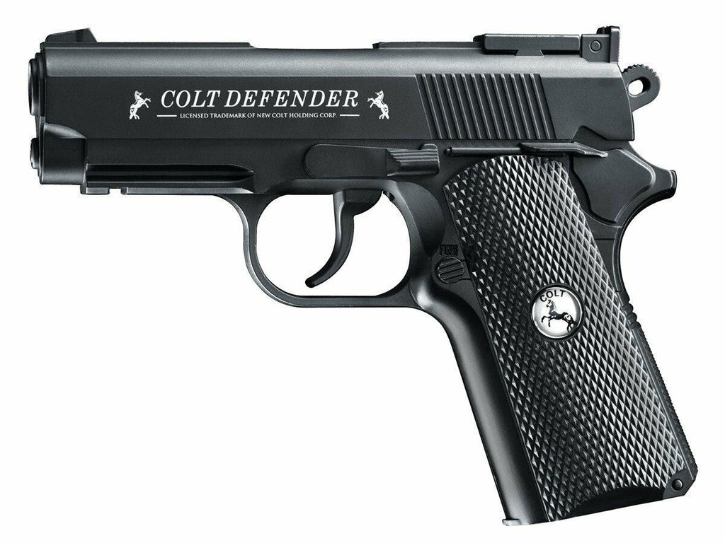 The new Colt Defender 1911 airgun from UMAREX is a .177 caliber Co2 powered pistol, and is not permitted for use in airsoft competitions or skirmishes. This premium grade airgun combines high-performance with high value, and is perfect for those looking for a powerful practice pistol on a budget; without having to make compromises in quality or performance. A single 12g Co2 cartridge powers this training pistol and is housed within the polymer grip. The specially designed textured grip offers a comfortable platform while providing optimal grip and stability in all weather conditions. This fully licensed Colt replica is constructed completely from metal to provide the most authentic weight and feel possible to this 1911 replica. A small weaver rail is integrated underneath the barrel of the pistol for the option to attach your choice of tactical flashlight or laser. Fixed front and rear sights allow users to quickly and accurately zero in their targets without the need of an additional optic accessory. The semi-auto design allows you to fire as fast as you can pull the trigger, with no delay or having to manually cock back the slide between each shot. Hone in your shooting skills with the Colt Defender 1911 airgun from UMAREX.